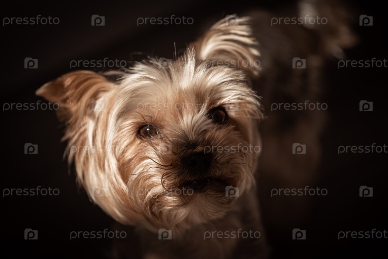 Портрет йоркширского терьера крупным планом. Портрет собаки йоркширского терьера на светлом, размытом фоне, избирательный фокус