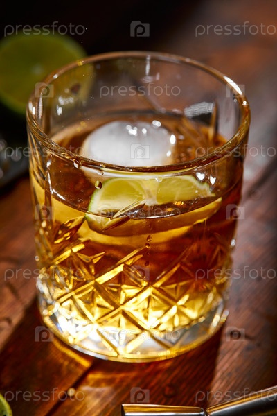 Летний напиток, виски, текила или коньяк, лимонад, алкогольный или безалкогольный коктейль с лаймом и солью на деревянном столе