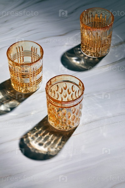Три пустых стеклянных стакана на светлом фоне с тенями от солнечного света