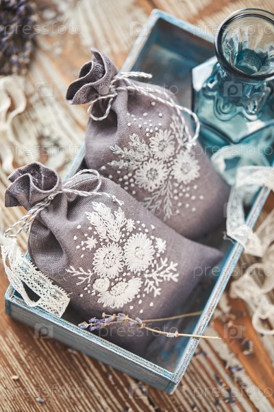 Саше с вышивкой, наполненной лавандой на деревянном фоне