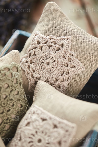 Сумки-саше, украшенные вязаным кружевом и лавандой на деревянном фоне