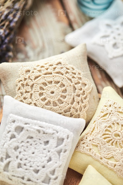 Сумки-саше, украшенные вязаным кружевом и лавандой на деревянном фоне