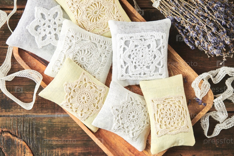 Сумки-саше, украшенные вязаным кружевом и лавандой на деревянном фоне