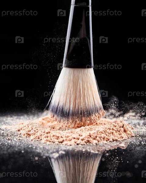 Кисть для макияжа с рассыпчатой косметической пудрой на черном фоне