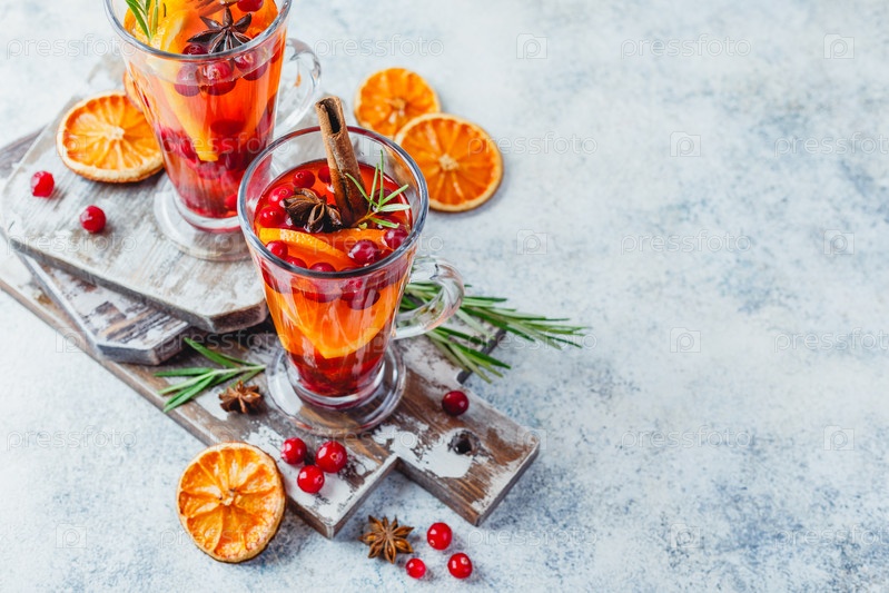 Апельсиновые и клюквенные напитки с дольками апельсина и специями. Горячие напитки на зиму и Рождество
