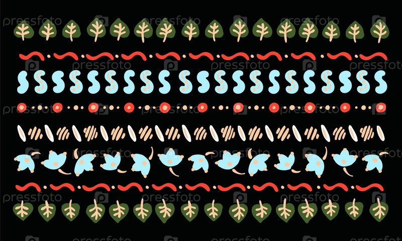 Набор этнических элементов. Бордюр представляет собой полосу с цветами, листьями, ветками, вензелями. Народная вышивка. Славянский, украинский, русский мотив. Хохлома, матрешка, дымковская игрушка. Мексиканский, индийский, цыганский ковер. Вязаное кружево