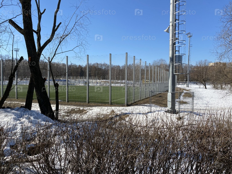 Футбольное поле возле забора в зимний солнечный день