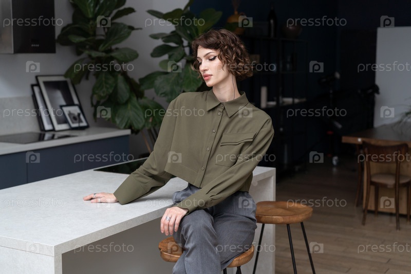 Молодая красивая женщина сидит на стуле в зеленой блузке