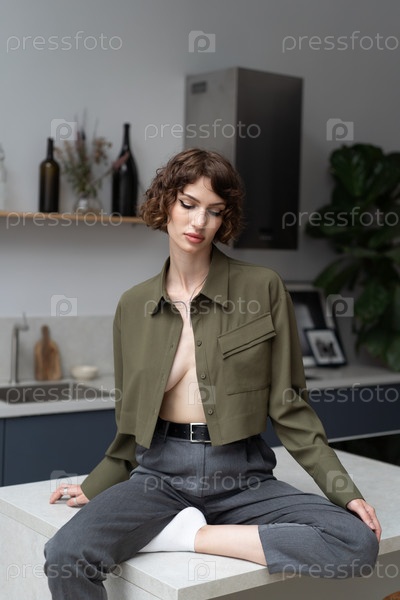 Молодая красивая женщина сидит на стуле в зеленой блузке