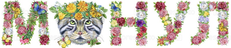 Слово МАНУЛ на русском из акварельных цветов, изолированная рука, нарисованная на белом фоне, свадебный дизайн