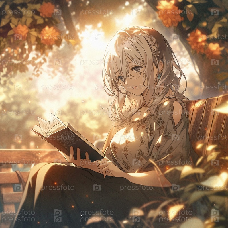 Девушка сидит под деревом и читает книгу. В стиле аниме