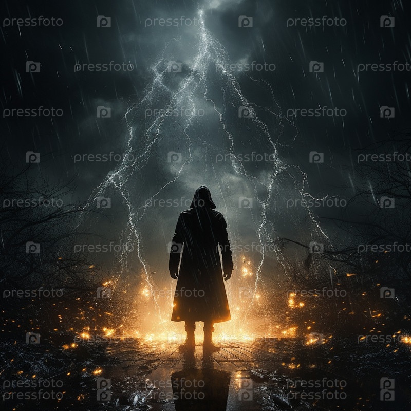 Таинственный мужчина в черном плаще окутан неизвестной энергией и молниями