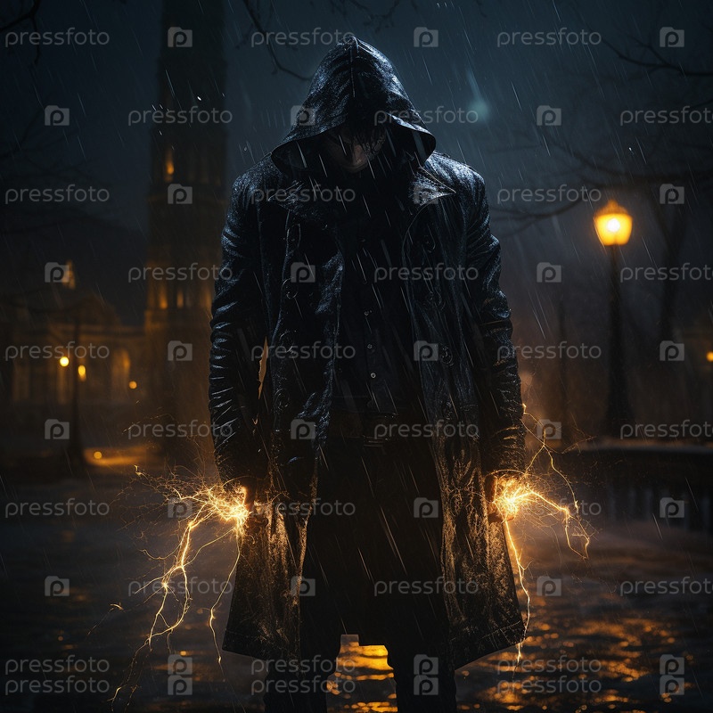 Таинственный мужчина в черном плаще окутан неизвестной энергией и молниями