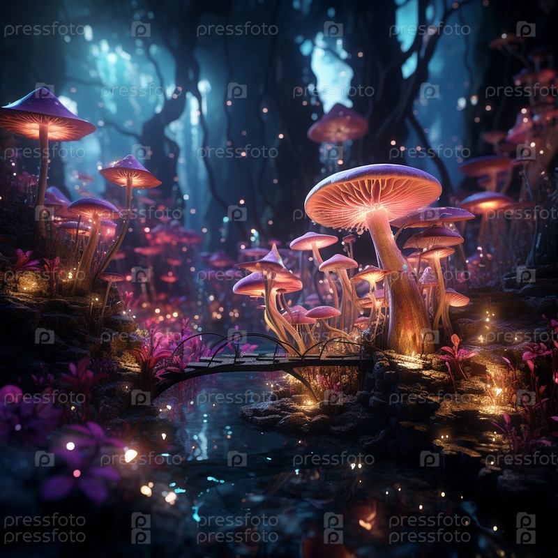 Сказочный лес окутан легким сиянием люминесцентных растений и светлячков