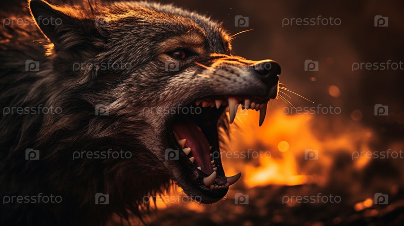 Оскал черного волка, окруженный пламенем