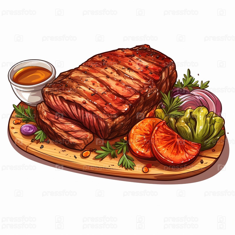 Графическое изображение вкусного стейка с овощами