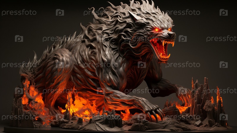 Скульптура страшного волка, охваченного пламенем