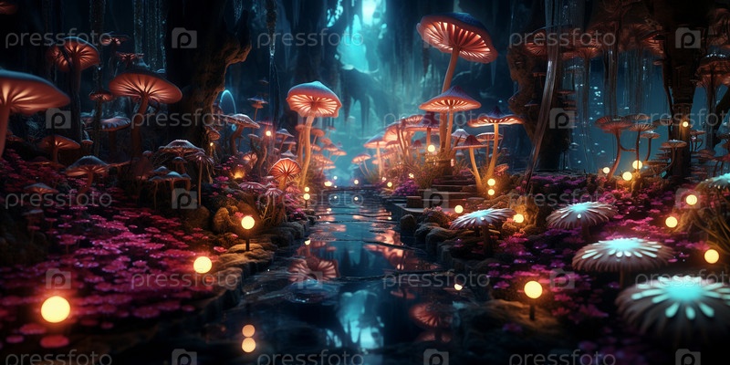 Сказочный лес окутан легким сиянием люминесцентных растений и светлячков
