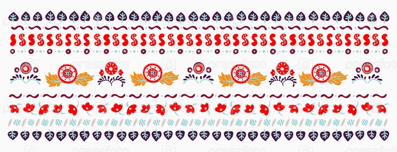 Набор этнических элементов. Бордюр представляет собой полосу с цветами, листьями, ветками, вензелями. Народная вышивка. Славянский, украинский, русский мотив. Хохлома, матрешка, дымковская игрушка. Мексиканский, индийский, цыганский ковер. Вязаное кружево