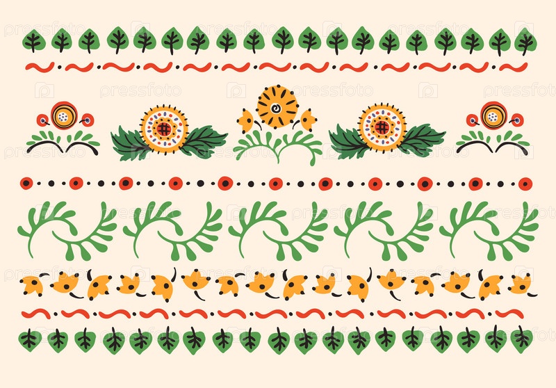 Набор этнических элементов. Бордюр представляет собой полосу с цветами, листьями, ветками, вензелями. Народная вышивка. Славянский, украинский, русский мотив. Хохлома, матрешка, дымковская игрушка. Мексиканский, индийский, цыганский ковер. Вязаное кружево