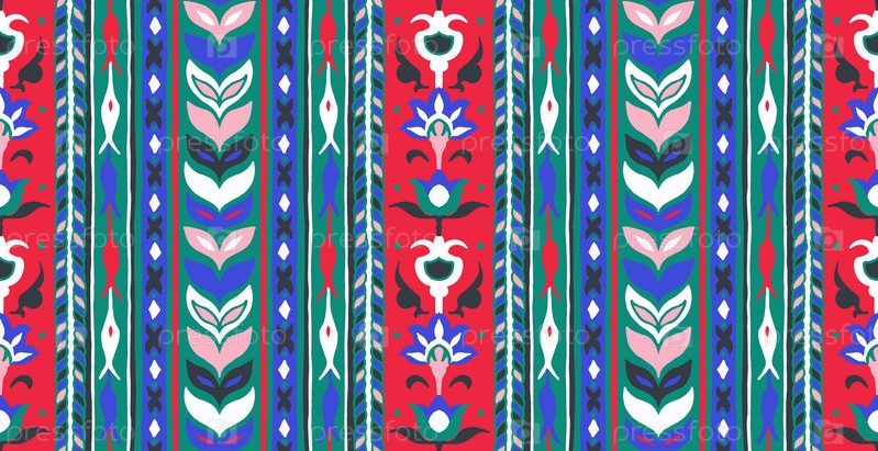 Геометрический дамасский орнамент. Икат границы. Этническая вышивка с листьями и монограммами. Племенная векторная текстура. Бесшовный народный узор в ацтекском стиле. Индийский, скандинавский, цыганский, мексиканский, африканский ковер