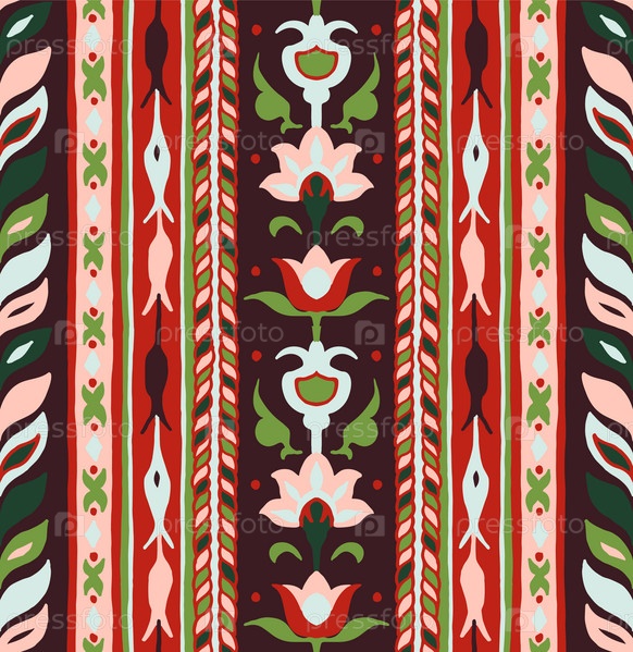 Геометрический дамасский орнамент. Икат границы. Этническая вышивка с листьями и монограммами. Племенная векторная текстура. Бесшовный народный узор в ацтекском стиле. Индийский, скандинавский, цыганский, мексиканский, африканский ковер