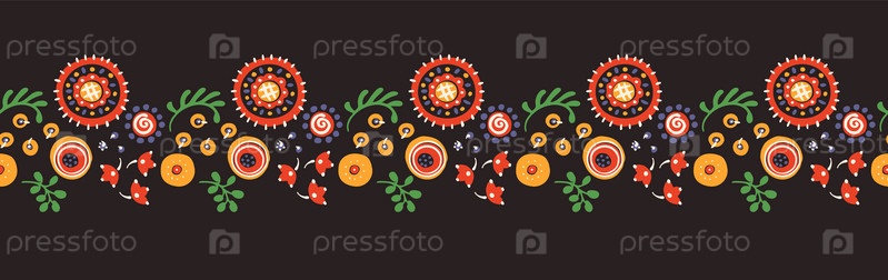Набор этнических элементов. Бордюр представляет собой полосу с цветами, листьями, ветками, вензелями. Народная вышивка. Славянский, украинский, русский мотив. Хохлома, матрешка, дымковская игрушка. Мексиканский, индийский, цыганский ковер. Вязаное кружево
