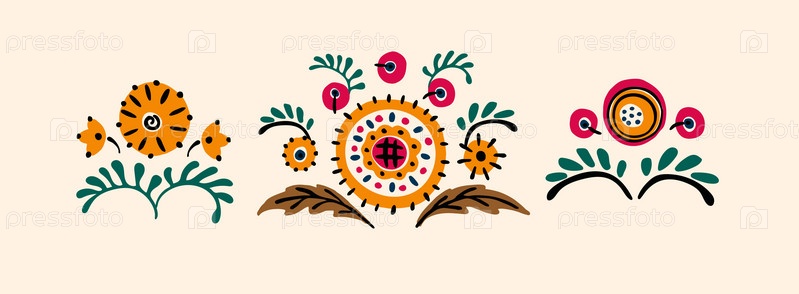 Набор этнических элементов. Бордюр представляет собой полосу с цветами, листьями, ветками, вензелями. Народная вышивка. Славянский, украинский, русский мотив. Хохлома, матрешка, дымковская игрушка. Мексиканский, индийский, цыганский ковер. Вязаное кружево