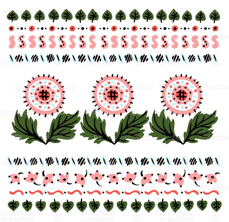 Набор этнических элементов. Бордюр представляет собой полосу с цветами, листьями, ветками, вензелями. Народная вышивка. Славянский, украинский, русский мотив. Хохлома, матрешка, дымковская игрушка. Мексиканский, индийский, цыганский ковер. Вязаное кружево