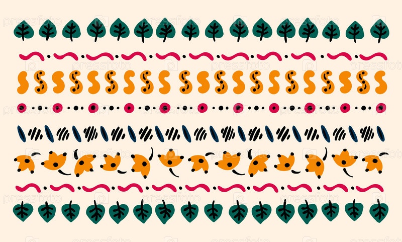 Набор этнических элементов. Бордюр представляет собой полосу с цветами, листьями, ветками, вензелями. Народная вышивка. Славянский, украинский, русский мотив. Хохлома, матрешка, дымковская игрушка. Мексиканский, индийский, цыганский ковер. Вязаное кружево