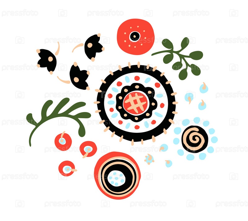 Набор этнических элементов. Бордюр представляет собой полосу с цветами, листьями, ветками, вензелями. Народная вышивка. Славянский, украинский, русский мотив. Хохлома, матрешка, дымковская игрушка. Мексиканский, индийский, цыганский ковер. Вязаное кружево