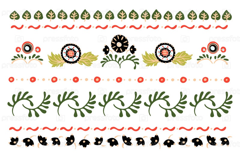 Набор этнических элементов. Бордюр представляет собой полосу с цветами, листьями, ветками, вензелями. Народная вышивка. Славянский, украинский, русский мотив. Хохлома, матрешка, дымковская игрушка. Мексиканский, индийский, цыганский ковер. Вязаное кружево