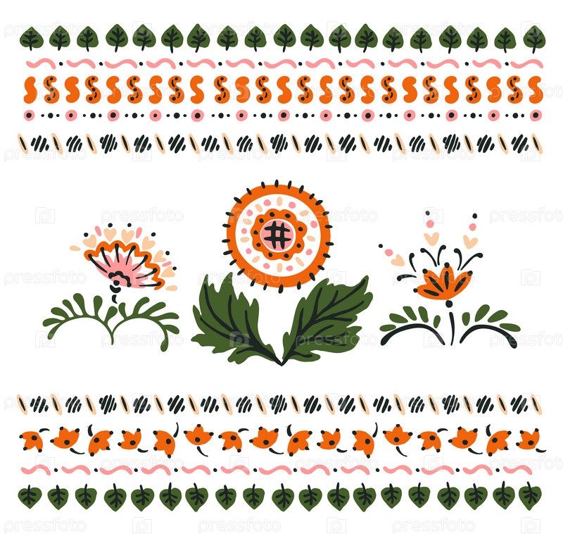 Набор этнических элементов. Бордюр представляет собой полосу с цветами, листьями, ветками, вензелями. Народная вышивка. Славянский, украинский, русский мотив. Хохлома, матрешка, дымковская игрушка. Мексиканский, индийский, цыганский ковер. Вязаное кружево
