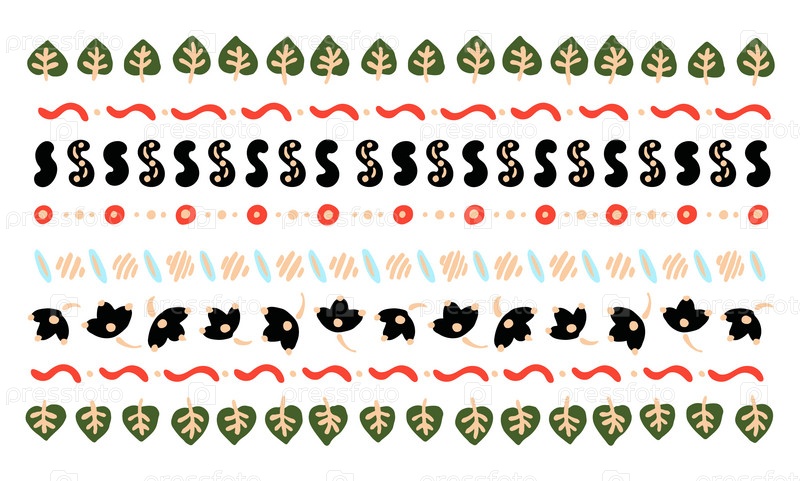 Набор этнических элементов. Бордюр представляет собой полосу с цветами, листьями, ветками, вензелями. Народная вышивка. Славянский, украинский, русский мотив. Хохлома, матрешка, дымковская игрушка. Мексиканский, индийский, цыганский ковер. Вязаное кружево