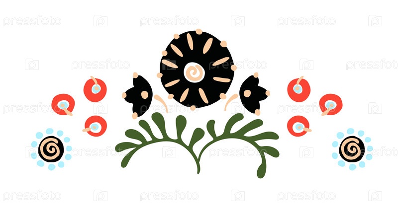 Набор этнических элементов. Бордюр представляет собой полосу с цветами, листьями, ветками, вензелями. Народная вышивка. Славянский, украинский, русский мотив. Хохлома, матрешка, дымковская игрушка. Мексиканский, индийский, цыганский ковер. Вязаное кружево