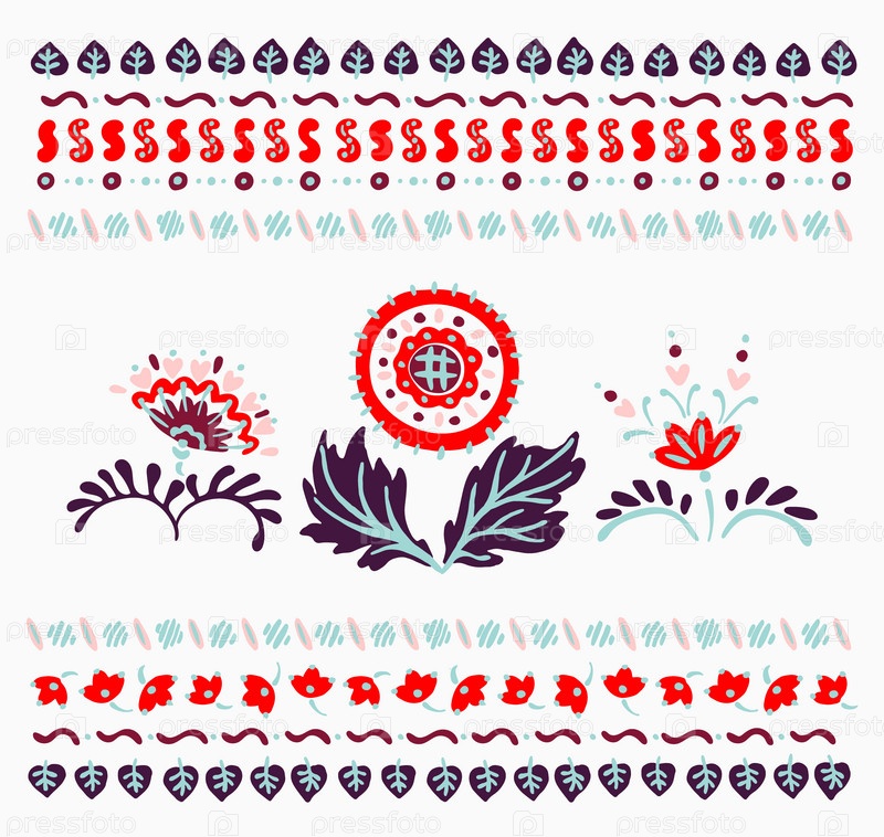 Набор этнических элементов. Бордюр представляет собой полосу с цветами, листьями, ветками, вензелями. Народная вышивка. Славянский, украинский, русский мотив. Хохлома, матрешка, дымковская игрушка. Мексиканский, индийский, цыганский ковер. Вязаное кружево