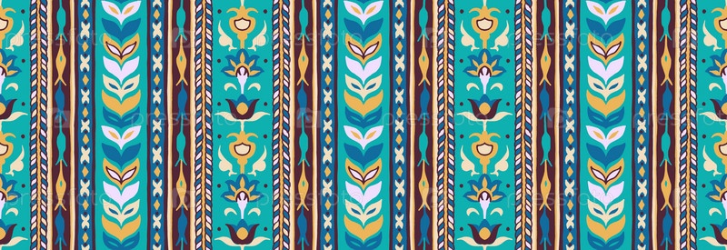 Геометрический дамасский орнамент. Икат границы. Этническая вышивка с листьями и монограммами. Племенная векторная текстура. Бесшовный народный узор в ацтекском стиле. Индийский, скандинавский, цыганский, мексиканский, африканский ковер