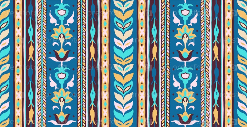 Геометрический дамасский орнамент. Икат границы. Этническая вышивка с листьями и монограммами. Племенная векторная текстура. Бесшовный народный узор в ацтекском стиле. Индийский, скандинавский, цыганский, мексиканский, африканский ковер
