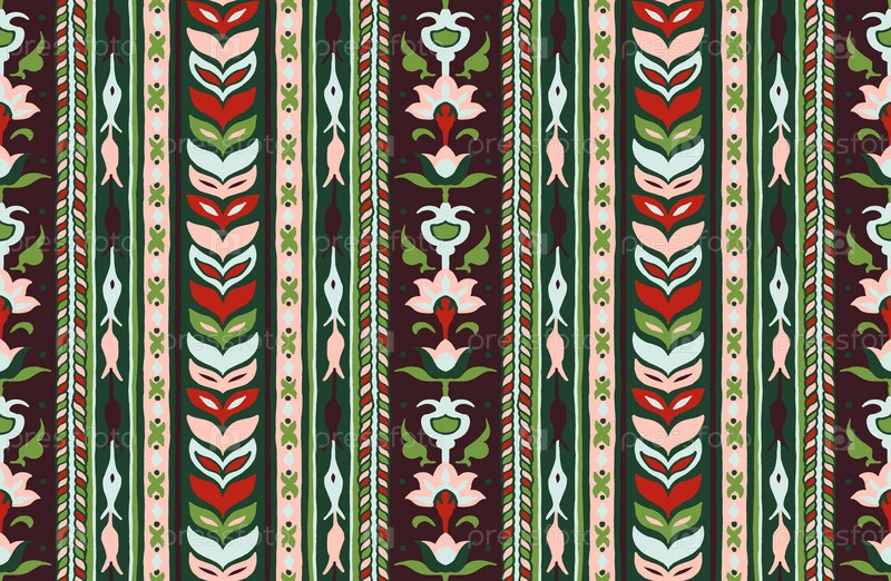 Геометрический дамасский орнамент. Икат границы. Этническая вышивка с листьями и монограммами. Племенная векторная текстура. Бесшовный народный узор в ацтекском стиле. Индийский, скандинавский, цыганский, мексиканский, африканский ковер