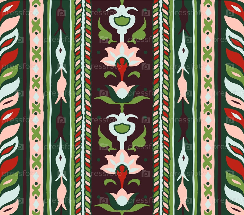 Геометрический дамасский орнамент. Икат границы. Этническая вышивка с листьями и монограммами. Племенная векторная текстура. Бесшовный народный узор в ацтекском стиле. Индийский, скандинавский, цыганский, мексиканский, африканский ковер