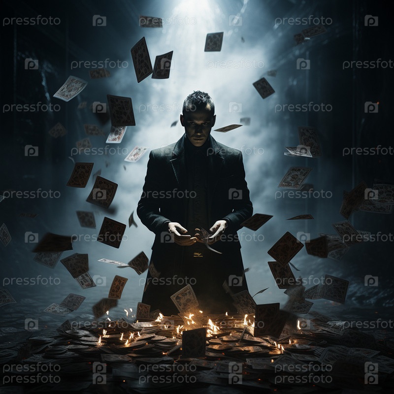 Таинственный человек в черном бросает игральные карты для покера