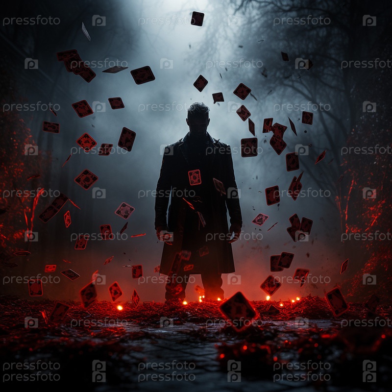 Таинственный человек в черном бросает игральные карты для покера