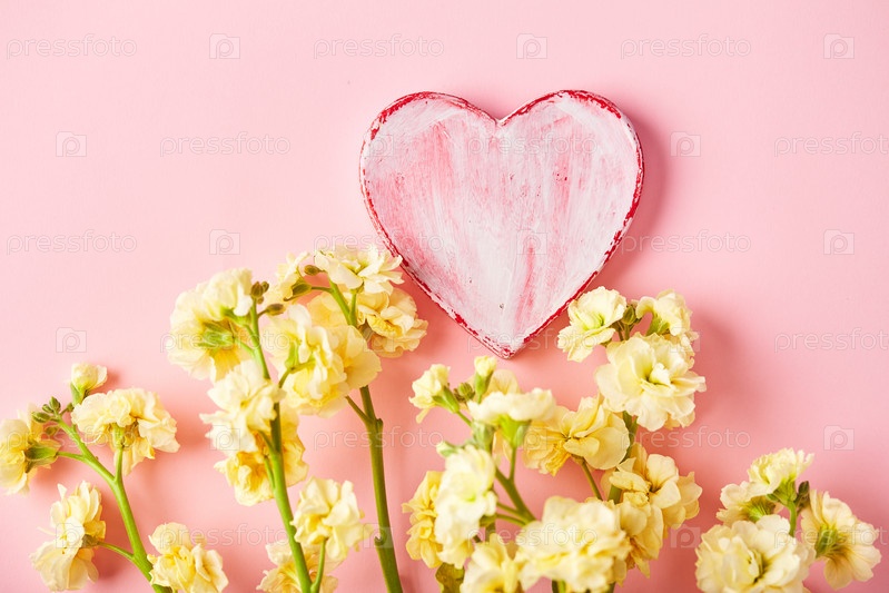 Букет желтой маттиолы с декоративным сердцем. Концепция дизайна праздничного поздравления с букетом на розовом столе