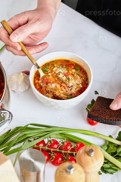 Украинский и русский традиционный борщ из красной свеклы, приготовленный из свеклы, капусты, картофеля, говядины и помидоров