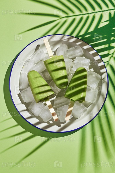 Замороженное домашнее фисташковое эскимо в миске со льдом на зеленом фоне. Освежающее эскимо, замороженный зеленый сок на палочке. Вид сверху, пространство для копирования