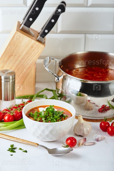 Украинский и русский традиционный борщ из красной свеклы, приготовленный из свеклы, капусты, картофеля, говядины и помидоров