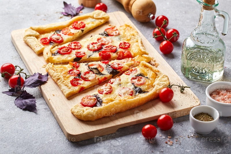 Пирог из слоеного теста с помидорами черри, моцареллой и фиолетовым базиликом