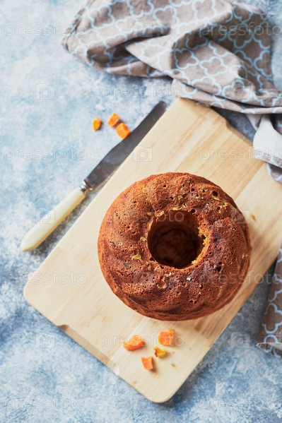 Домашний осенний морковный пирог с цукатами на деревянной разделочной доске