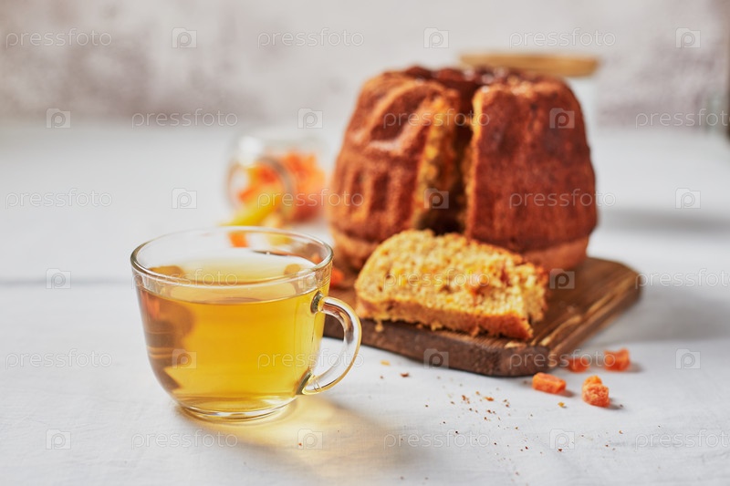 Домашний осенний морковный или тыквенный пирог с цукатами, чашкой чая и золотыми декоративными тыквами