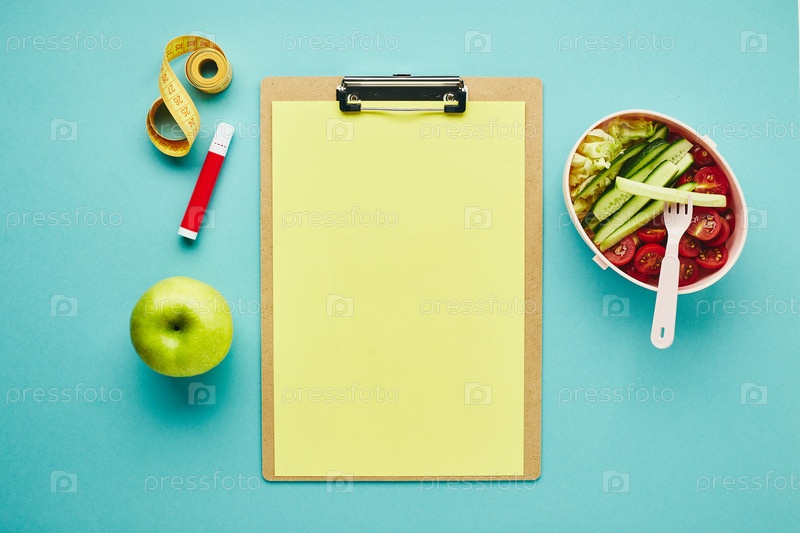 Папка-планшет для бумаги, зеленого яблока и коробки для завтрака со здоровым овощным салатом на голубом фоне. Концепция планирования упражнений и правильного питания